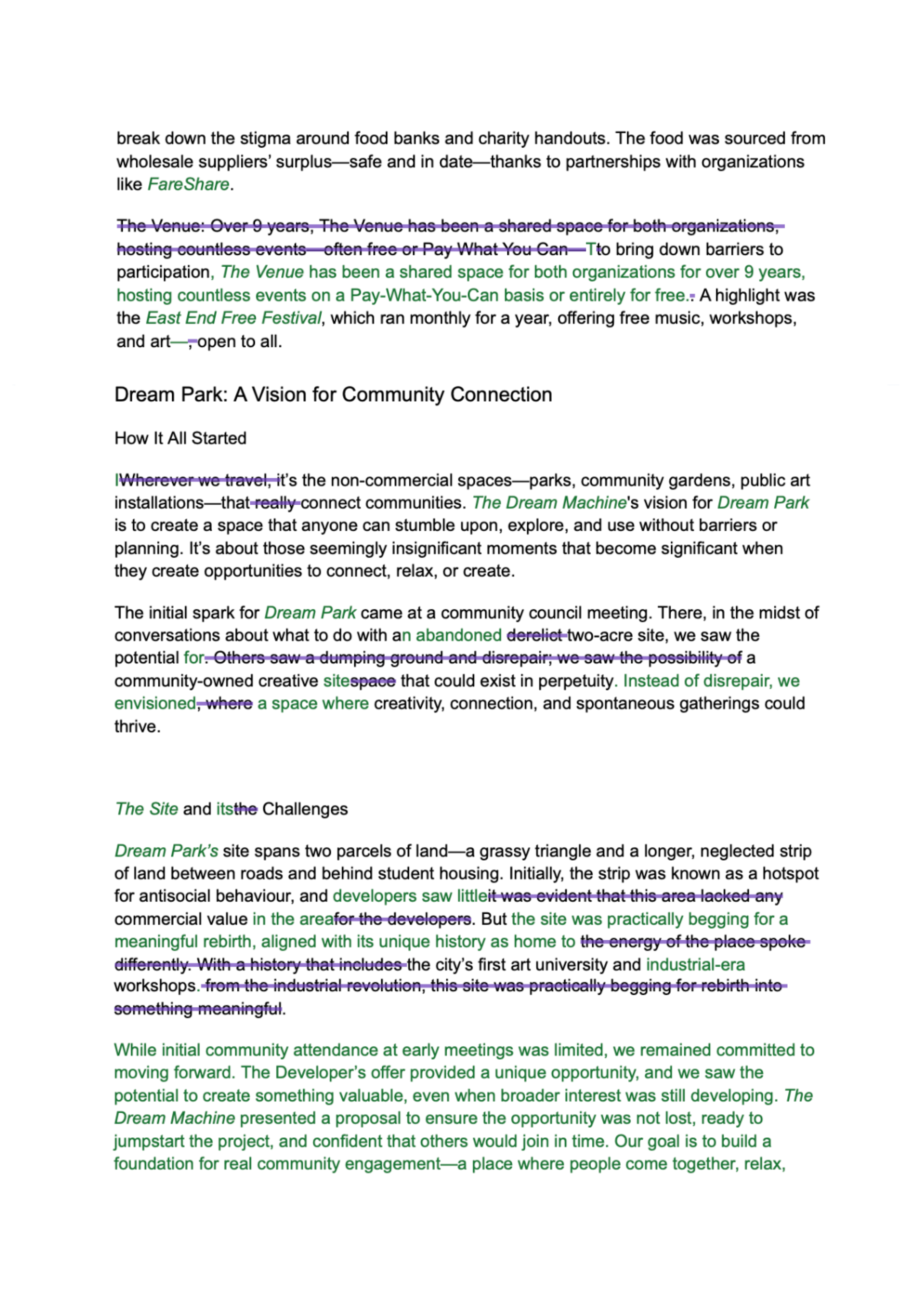 Editing Editing a sample of a Solarpunk novel Editing a zine for clarity, coherence, style, and grammar. Editing transcriptions for clarity, coherence, and tone, and rewriting the content into a playbook-style business guide.